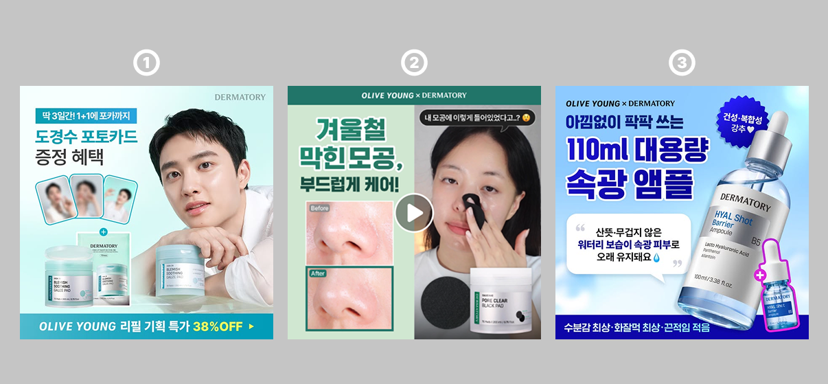 뷰티 업계에서 올리브영의 플랫폼 파워가 압도적이라는 건 누구나 알고 있는 사실입니다. 그런 올리브영 랭킹 TOP3 안에 포진해 있는 브랜드가 직접 운영하고 있는 광고 소재, 무엇인지 궁금하지 않으신가요? 그래서 오늘 기준 올리브영 랭킹 1, 2, 3위에 랭크되어 있는 더마토리, 메디힐, 달바의 메타 광고 소재를 3개씩 가져와서 비교 분석해 보려고 합니다.