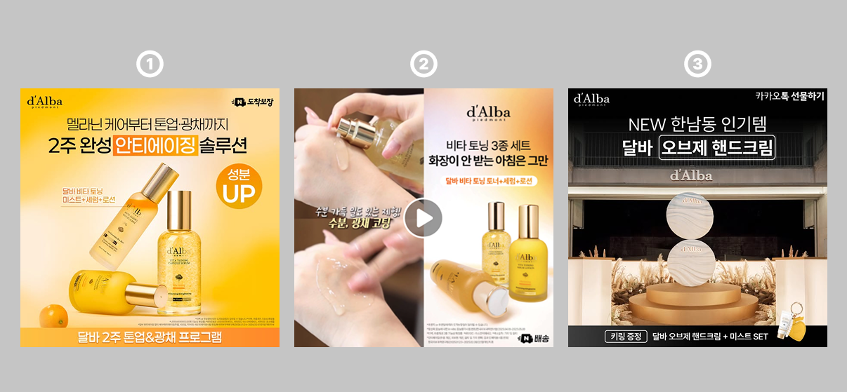 랭킹 5위에 단독으로 오르며 종합 3위인 달바의 광고 소재는 앞선 더마토리와 메디힐에 비하면 차분합니다. 글씨체도 정제되어 있고 과하게 요란하다는 느낌도 없죠. 그런 면에서는 분명히 기존 뷰티 브랜드와 차별점을 두려고 한 모습이고 달바라는 브랜드 방향성과도 어느 정도 맞아 보이는데요. 다만 1번 소재의 ‘성분UP’ 딱지라던가 실사용 영상과 제품 이미지를 혼합한 2번 소재를 보면 기존 뷰티 업계에서 클리셰처럼 사용하는 소재 유형을 완전히 버리지는 못한 모습입니다. 여기에 더해 특이한 점은 1, 2번 소재에 ‘N배송’딱지와 함께 하단에 읽히지 않을 정도로 작고 긴 글씨를 적어뒀다는 건데요. 안 그래도 텍스트와 이미지가 빽빽한 소재에 꼭 들어가야 하는 요소들이었는지는 개인적으로 의문이 남네요.